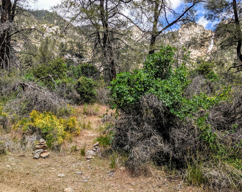 Scramble up the right side of the small creek bank following cairns. After a short steep climb, there is a little pathway through some oak trees after which the route climbs over another boulder. Climb up the hillside to the right of a granite slab, and look for another passageway through oak trees at the side of a huge boulder. Continue traversing south toward the creek and the route pops out at a large sunny slab across from the Middle Falls.