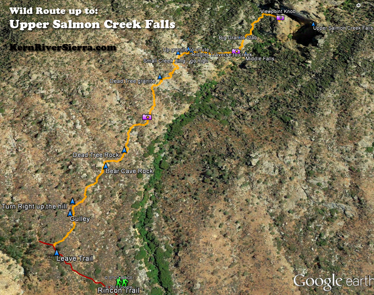Click here for a full Description of the 450 foot Salmon Creek Falls and the access via Rincon Trail. This route picks up from the Rincon Trail 1/3 mile above the Salmon Creek Bridge and scrambles rough terrain up to the Middle and Upper Falls area.